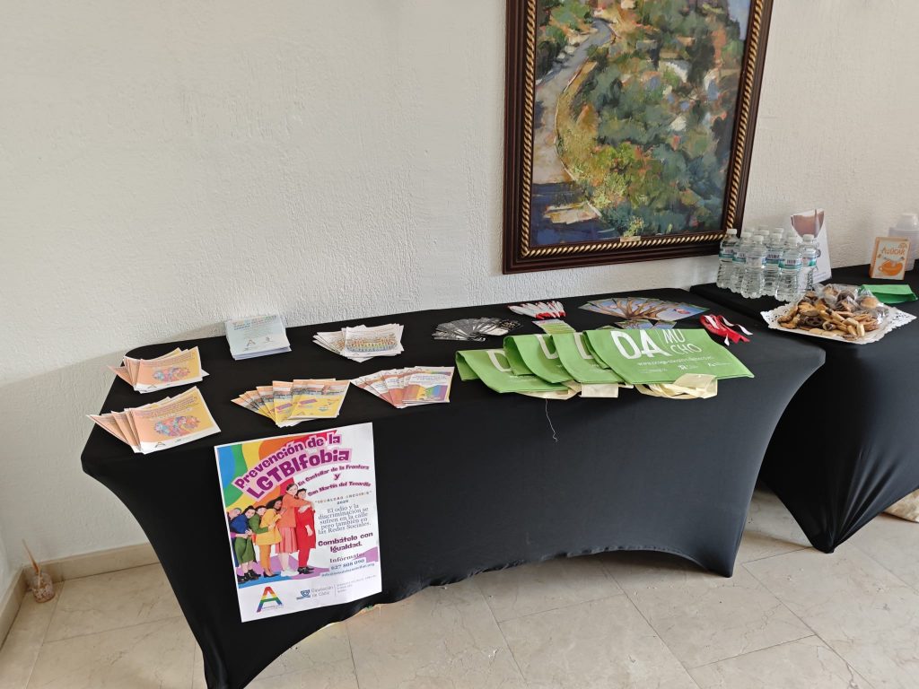 Mesa informativa Sobre LGTBIfobia, diversidad afectivo-sexual, de género y salud sexual en la entrada del salón de plenos del Ayuntamiento de Castellar de la Frontera.