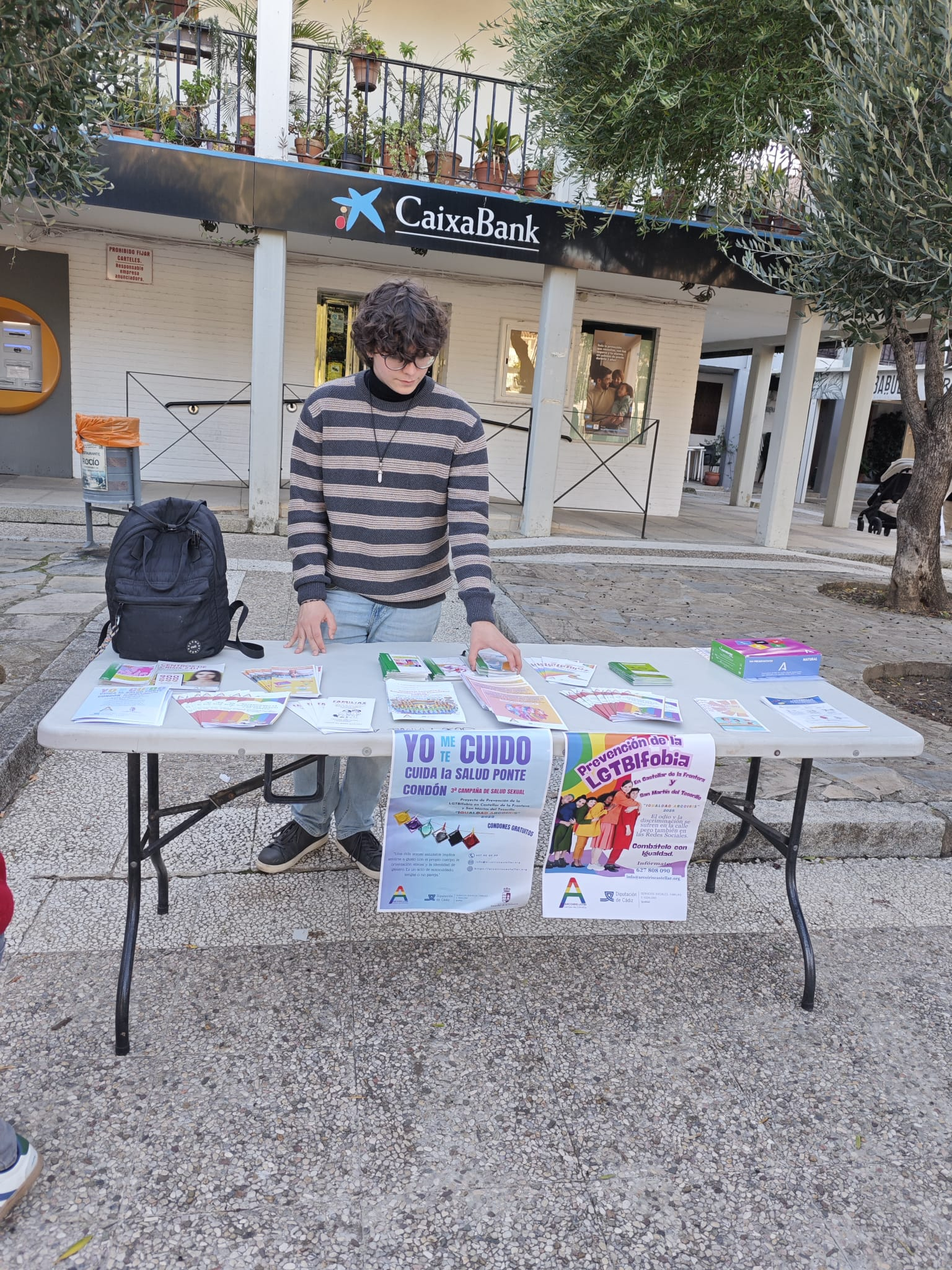 Mesa informativa Sobre LGTBIfobia, diversidad afectivo-sexual, de género y salud sexual en la Zona peatonal frente a la oficina de La Caixa, Castellar de la Frontera.